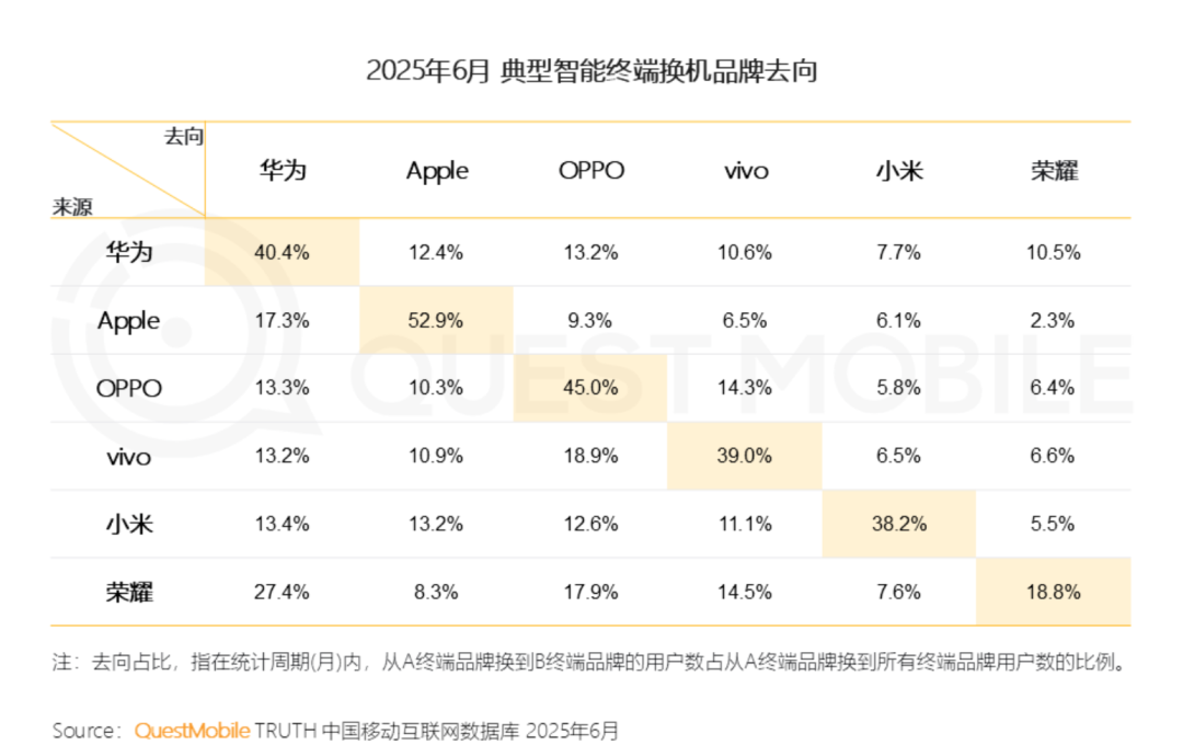 QuestMobile数据显示,2023年6月、2024年2月、2026年6月,iPhone同品牌换机率分别为55.3%、53.6%、52.9%,一路走低。而IDC数据显示,2025年Q2,华为市占率为18.1%,自2020年Q4之后,时隔四年,重返中国智能手机市场第一。