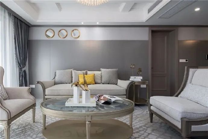 沙发选择的是米白色的美式风沙发,这样的美式风才不会显得太过于复古,毕竟太复古就有点老气了,因为背景墙装饰材料是灰色环保材料,所以米白色的家具搭配会更好看。
