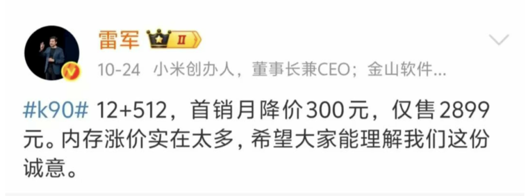 让我们把时间拨回 10 月 24 日,红米 K90 系列发布之日。雷军、卢伟冰两位高管在社交平台上大吐苦水,说 K90 系列涨价实属“无奈之举”,因为内存涨价实在太多,请大家多多包涵。