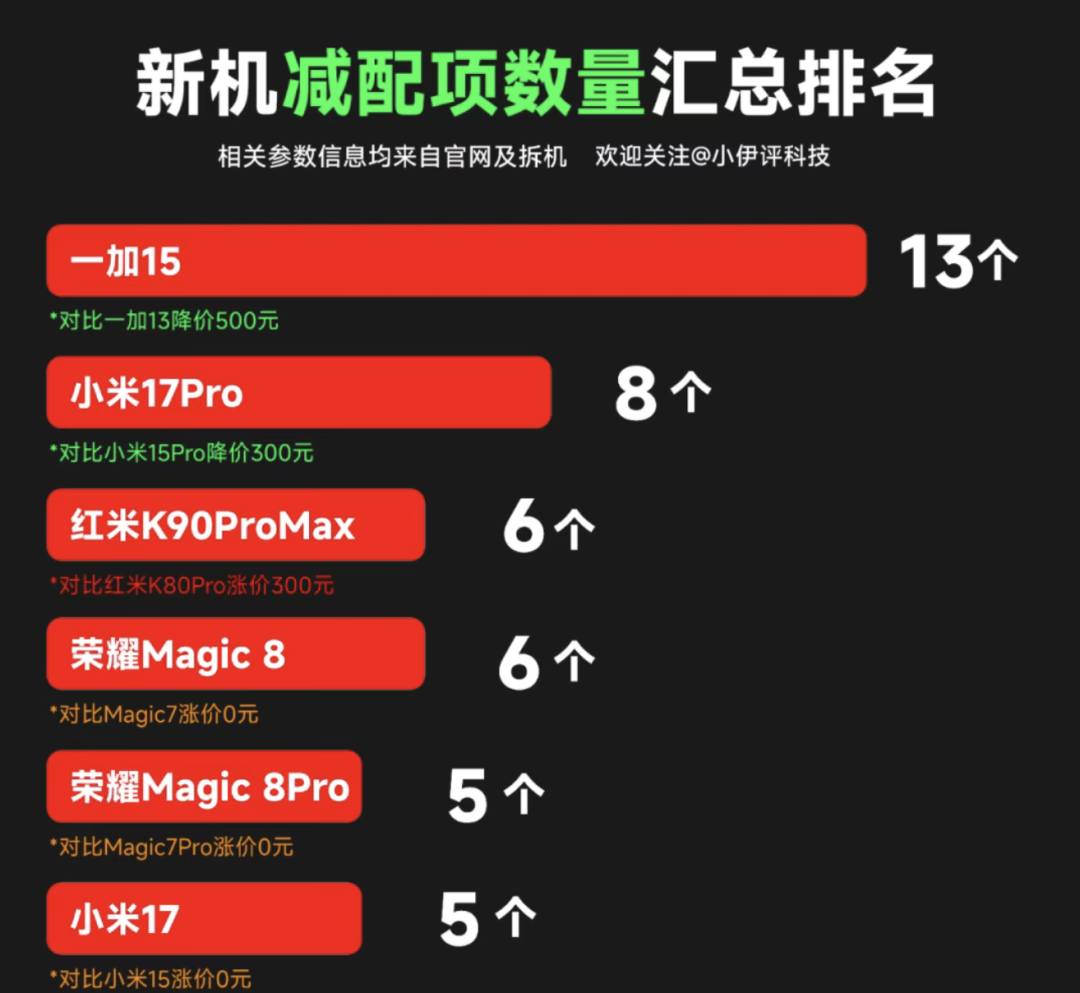 最可怕的,要数一加 15 系列:减配项数量足足达到了 13 个,成了今年的降配置之王;排名第二的小米 17 Pro和排第三的红米 K90 Pro Max,则分别有个 8 个和 6 个配置降配,要知道红米 K90 Pro Max 还是一款起售价涨了 300 块的机型。