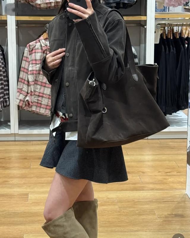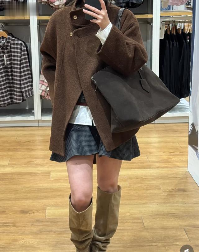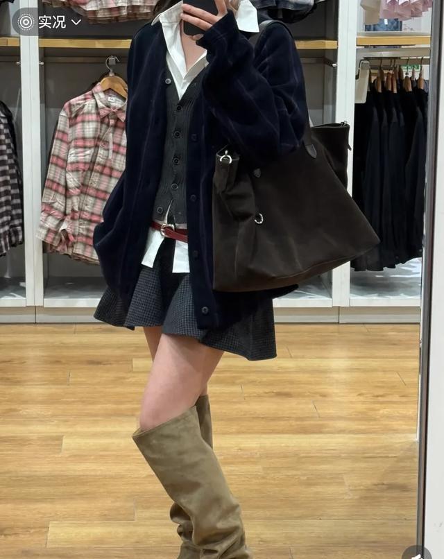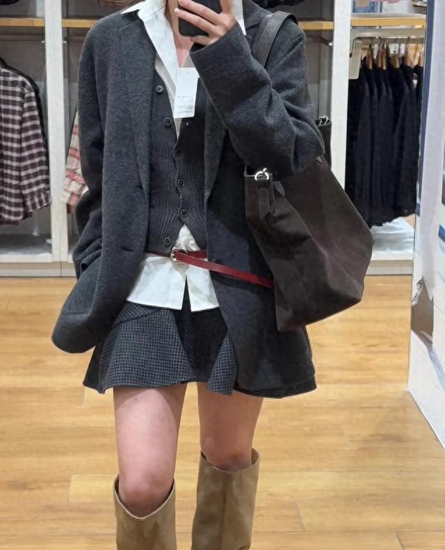 格纹裙我拿了165,腰肥一圈,但胯部刚好,复古滤镜直接拉满。试衣间灯光惨白,我套件白衬+灰西装,镜子里秒变月薪三万的律政俏佳人;换棕色呢外套,领口露出一点白边,同事说我像偷穿了爸爸衣服的法航大小姐。最绝的是深蓝灯芯绒开衫,扣子一系,复古味焊死在身上,地铁安检小哥多看了我三眼。
