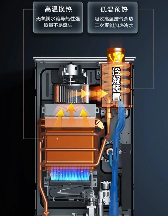 这样一来,水最终获得的热量就不仅仅来自于火焰,还来自于在进入内胆前的预热装置。