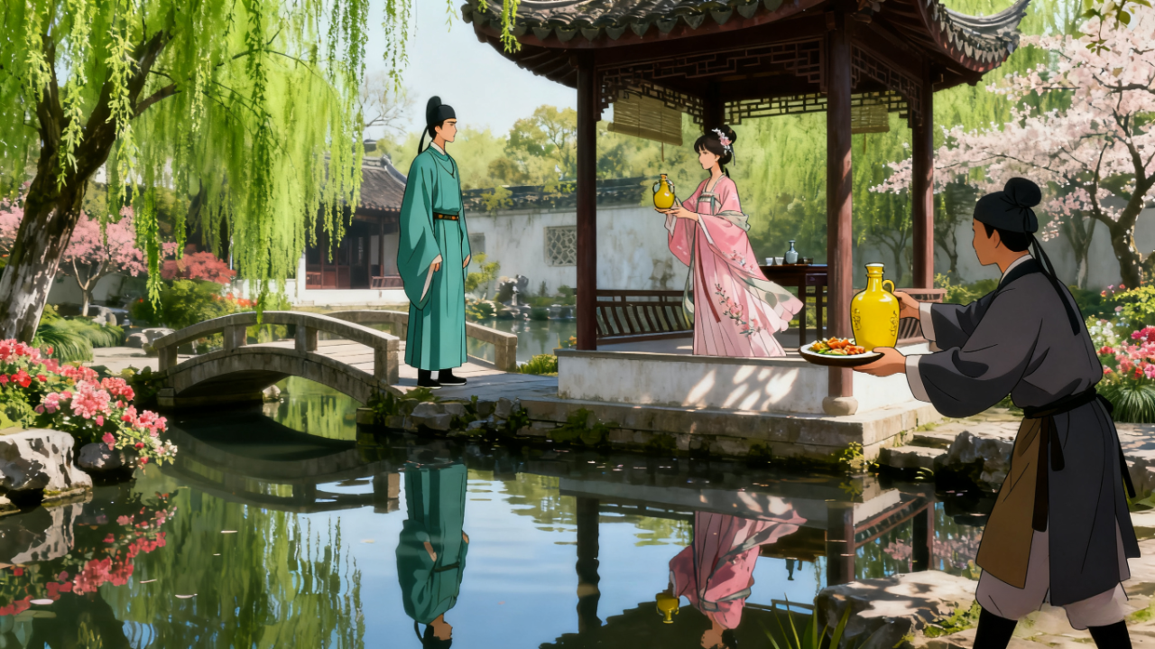 陆游因公务返乡,独步园中。忽见前方亭中,一女子正执壶斟酒——正是唐婉。