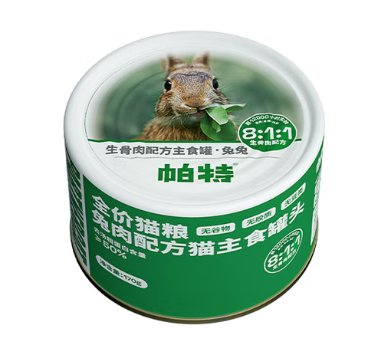 猫罐头便宜又好的测评:帕特猫罐头是国产品牌,自有工厂生产,原料供应商和第三方质检报告都公开,检测只覆盖了粗蛋白、粗脂肪等10个基础项目。主要采用冷冻肉,有兔肉、鸵鸟肉、鹌鹑三种口味,两种肉源组合,即冻兔肉/冻鸵鸟肉/冻鹌鹑+冻鸡胸肉,搭配鸡脆骨、冻内脏、三文鱼油、鸡油。粗蛋白为50%,粗脂肪为15%。单罐170 g,不同口味单价不同,兔肉味约13.5元、鸵鸟味约18元、鹌鹑味约19元。