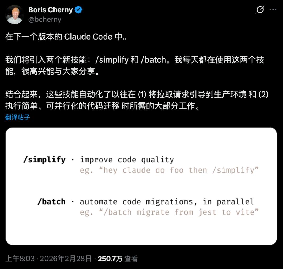 这是今年2月底才出的内置Skill,Boris之前发了个帖子介绍说他自己每天都在用。