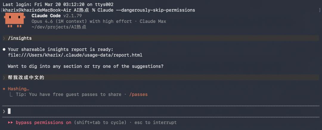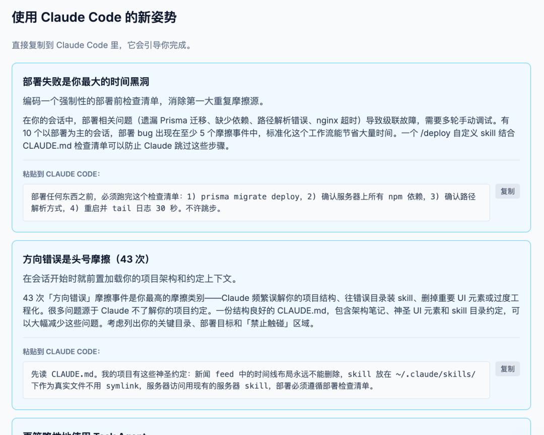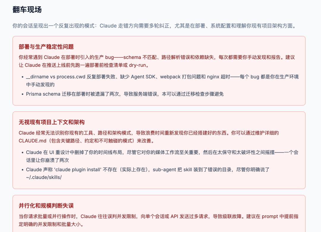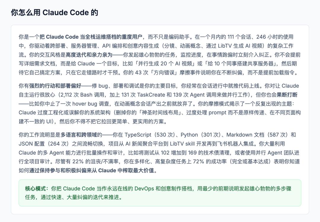 它会生成一份HTML报告,分析你过去一个月使用Claude Code的习惯,包括你最常用哪些命令,你有哪些重复性的操作模式,然后给你推荐一些自定义命令和Skills。