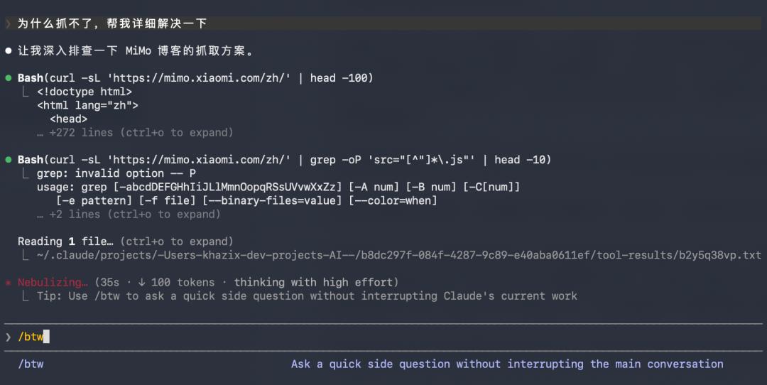 现在打/btw,然后说一个问题,比如我在执行过程中,突然想知道现在我这个项目的抓取流程是啥,我就可以直接敲/btw。
