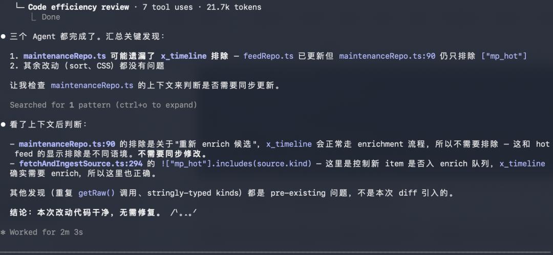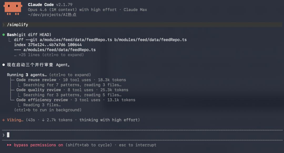 你输入/simplify之后,Claude Code会同时启动三个平行的Agent,分别从代码复用、代码质量、运行效率三个角度审查你的改动。