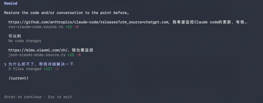 而现在,打/rewind会弹出菜单让你选,是只回退代码还是只回退对话。