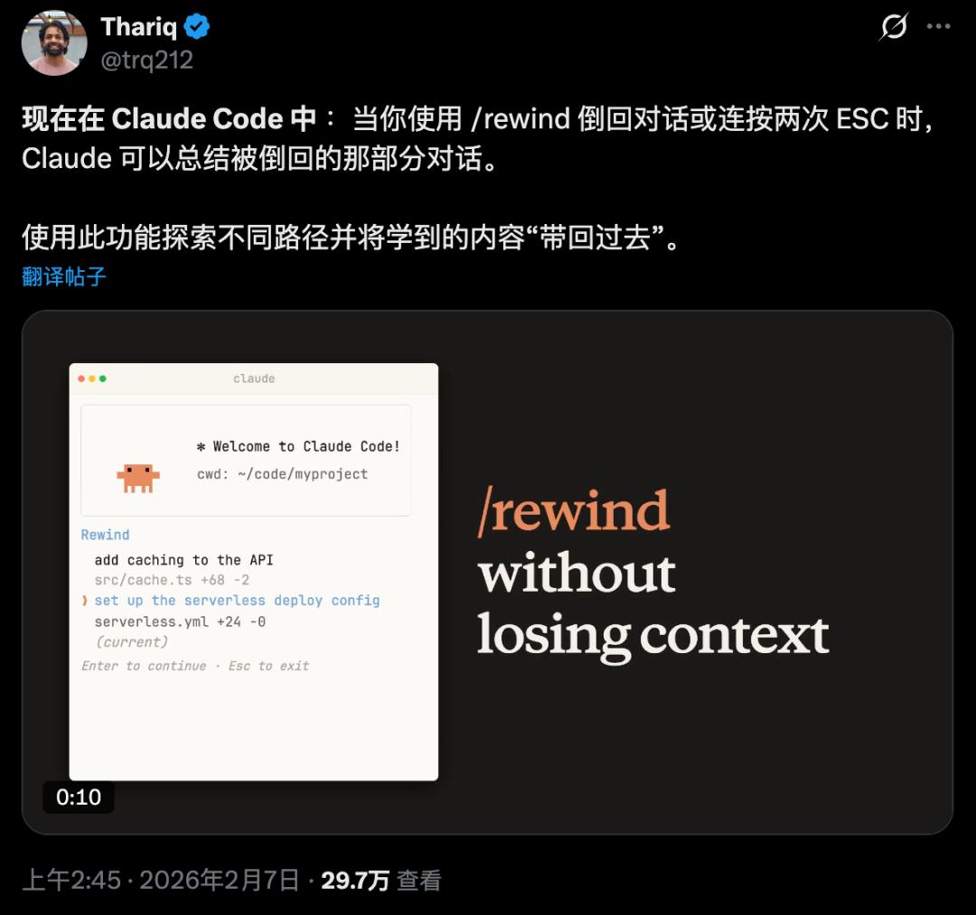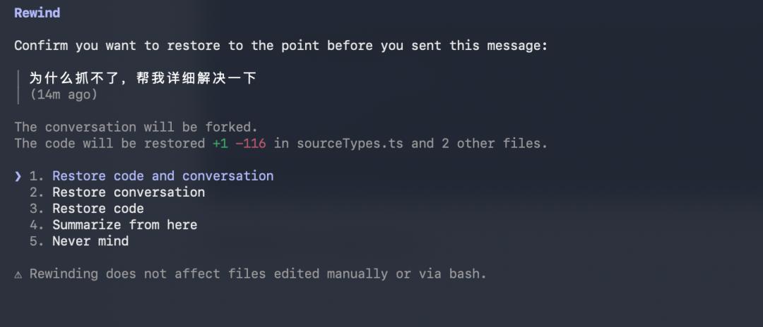这个命令之前就有,但2月的时候,升级了一个关键能力,就是代码和对话可以分别回退。