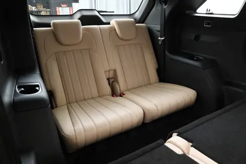 先看空间布局,这台车的轴距达到了2820mm,这也为灵活的座椅布局打下了基础。我们试驾的是七座版本,2+3+2的布局完全不局促,我身高183cm,坐进驾驶位,头部还有一拳两指的余量,肩部横向空间也很充裕,不会觉得压抑。第二排是全家的“黄金座位”,腿部空间能达到980mm,我跷二郎腿完全没问题。座椅支持前后260mm超长滑动和靠背角度调节,中间过道宽度约23cm,老人孩子上下第三排特别方便。贴心的是,第二排还配备了独立空调出风口、USB充电口和座椅加热功能,冬天带老人出门,长辈再也不用怕冷了。很多七座SUV的第三排都是“应急专用”,但山海L7 PLUS的第三排真能坐成年人。我老婆身高168cm,坐进第三排,头部还有三指余量,腿部离第二排座椅还有一拳距离,短途乘坐1-2小时完全不憋屈。而且第三排同样有空调出风口和充电口,细节做得很到位。