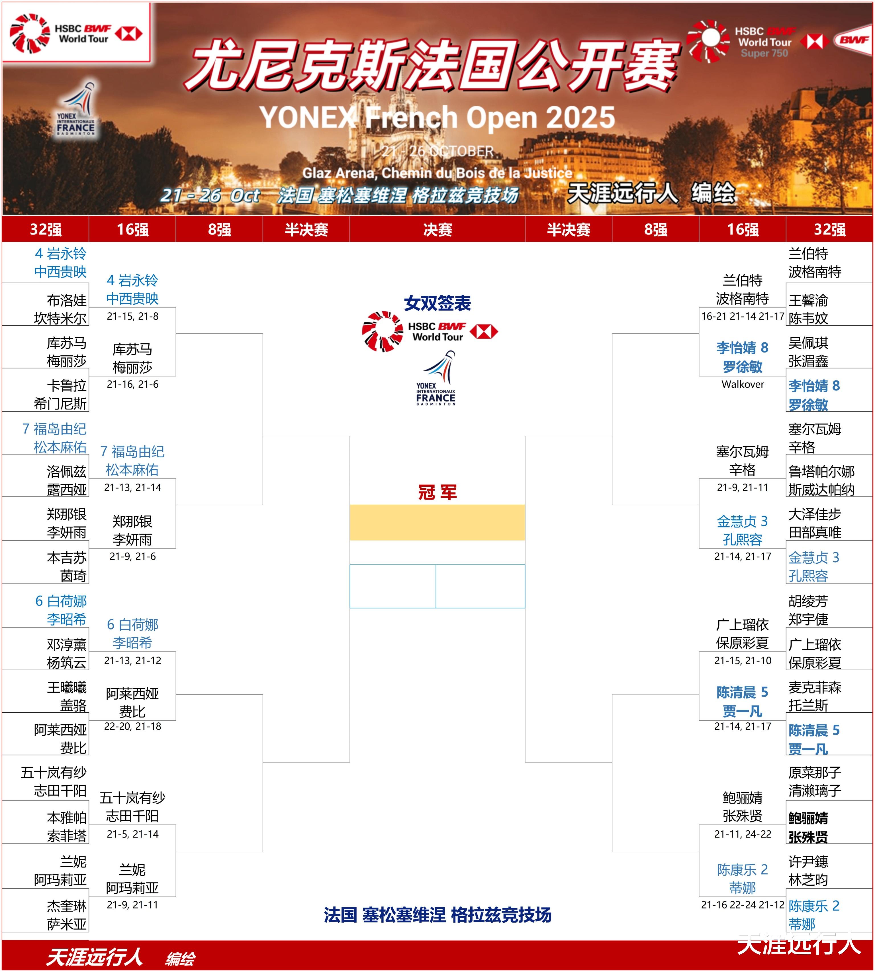 大马组合吴佩琪/张湄鑫赛前退赛,国羽李怡婧/罗徐敏不战而胜,晋级女双16强,下一场遭遇法国组合波格南特/兰伯特。