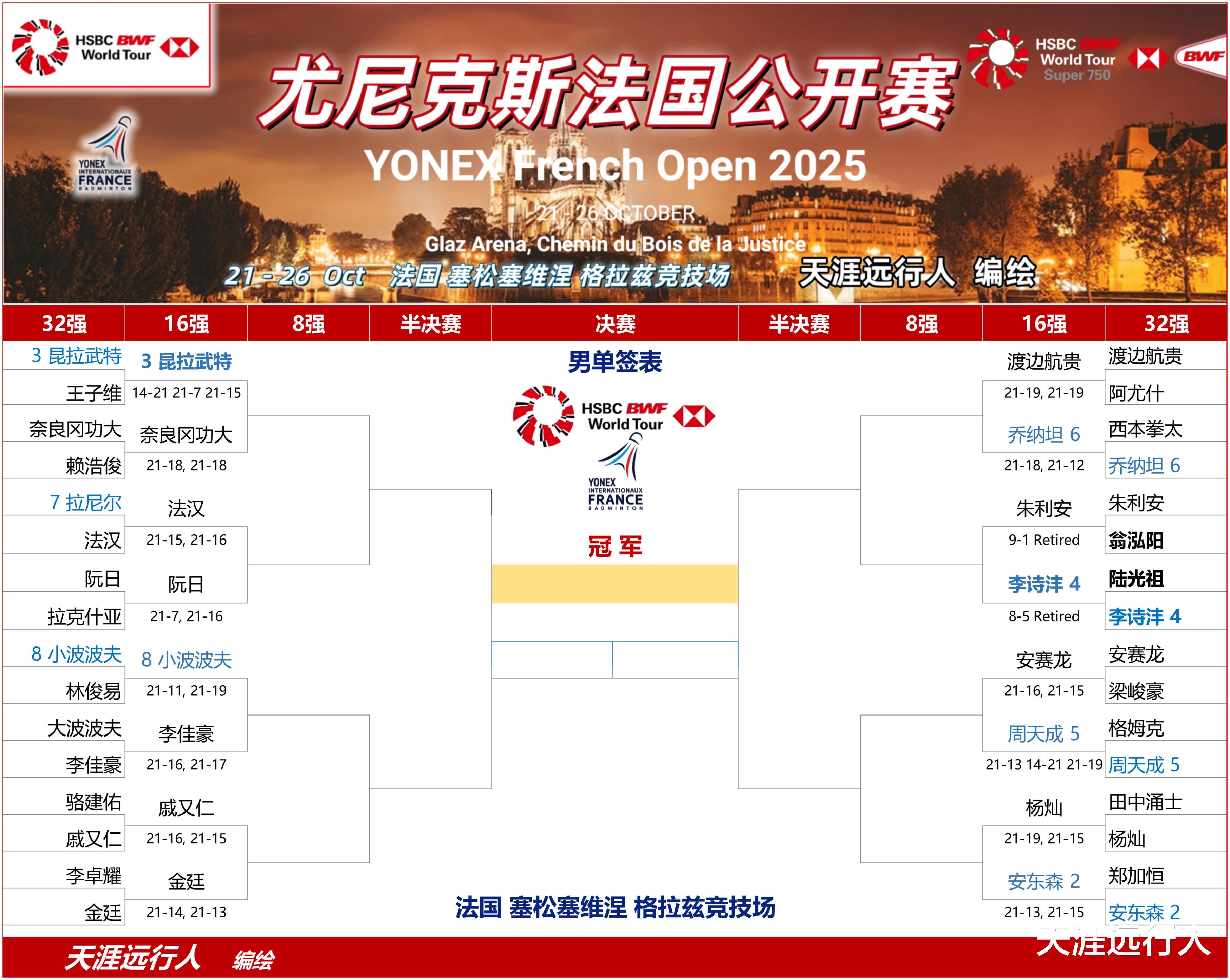北京时间10月23日凌晨1时52分,2025世界羽联超级750法国羽毛球公开赛,首轮第二比赛日的43场角逐,全部决出了胜负,赛会16强悉数产生。