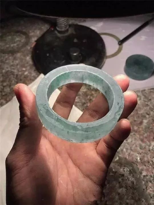 将镯胚分离出镯芯,近距离观一看,未抛光的手镯效果就已经非常迷人,水色欲滴,满满的飘花。
