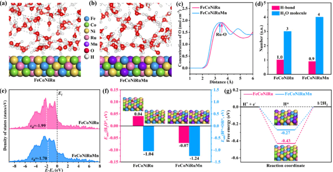 AIMD模拟显示,FeCoNiMnRu表面水分子与Ru的键距(1.95 Å)比FeCoNiRu(2.02 Å)更短,表明更强的水吸附能力。界面水浓度更高且氢键网络更无序,促进了H2O*/OH-的传输。