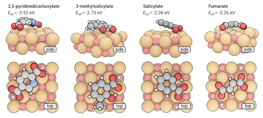 下图展示了四种小有机分子在部分羟基化MgO(100)表面的DFT计算吸附能,包含分子结构侧视图、顶视图和具体吸附能数值。