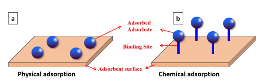 下图展示了物理吸附(无化学键形成,可逆)与化学吸附(形成化学键,不可逆)的机制差异。