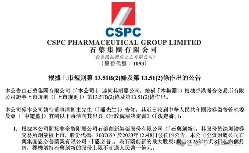 这起内幕交易事件的核心,始于2023年12月8日石药集团全资附属公司恩必普发布的一则增持计划。该计划称,恩必普拟在六个月内增持石药创新股份,上限不超过一亿元。
