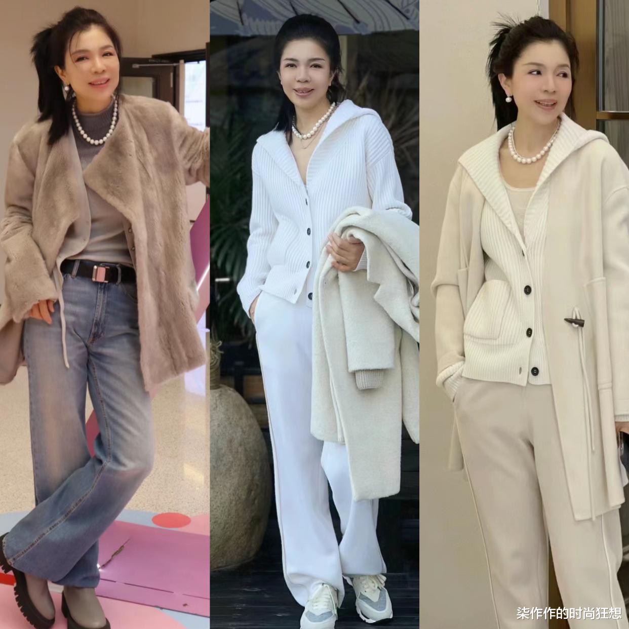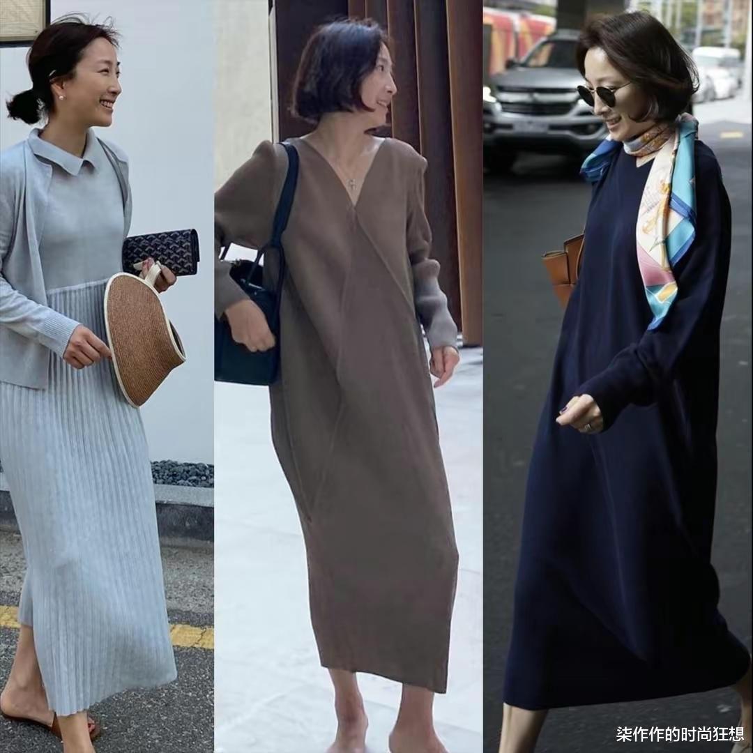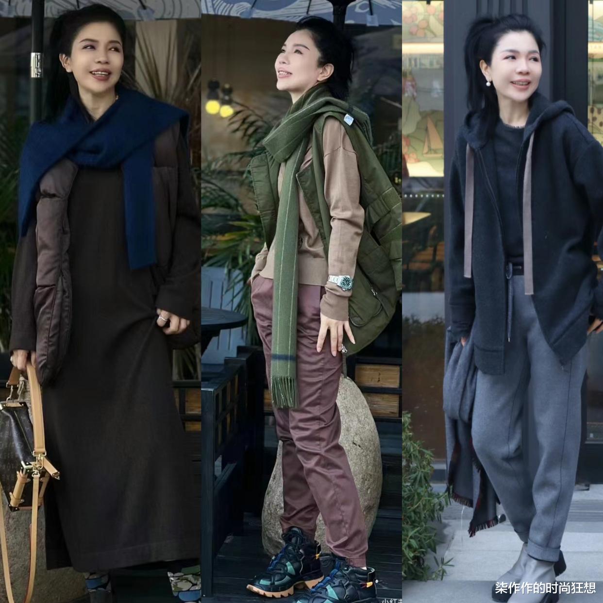 她的选款都是经典的基础单品,比如利落的烟管裤、宽松的针织衫,帅气的衬衫等,穿起来舒服,别人看着也舒服,不刻意装嫩,却很显年轻。
