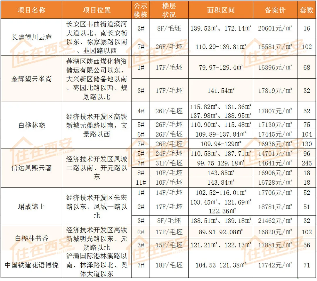 9月11-12日,西安7盘1320套房源公示一房一价,价格公示项目分别为:长建望川云庐、金辉望云峯尚、白桦林晓、信达凤熙云著、珺成锦上、白桦林书香、中国铁建花语博悦。