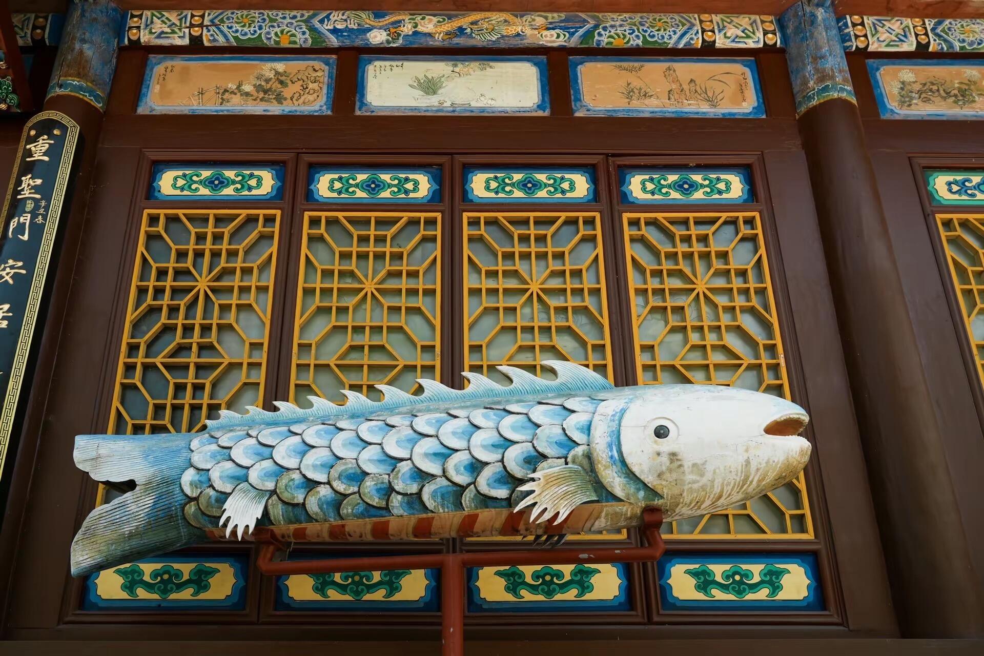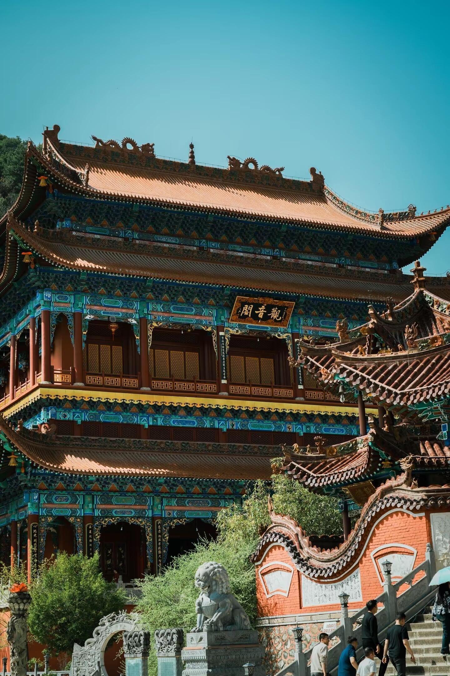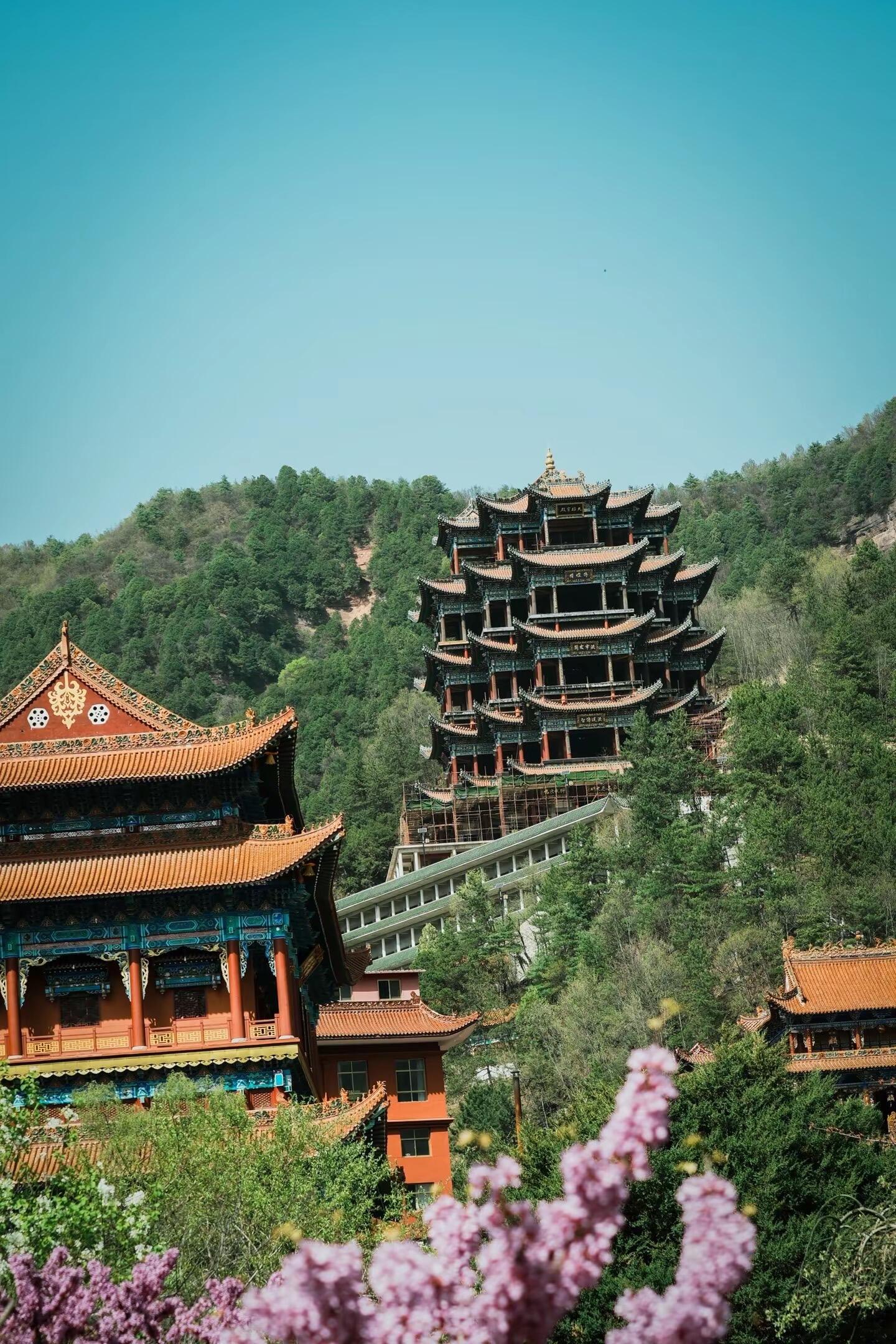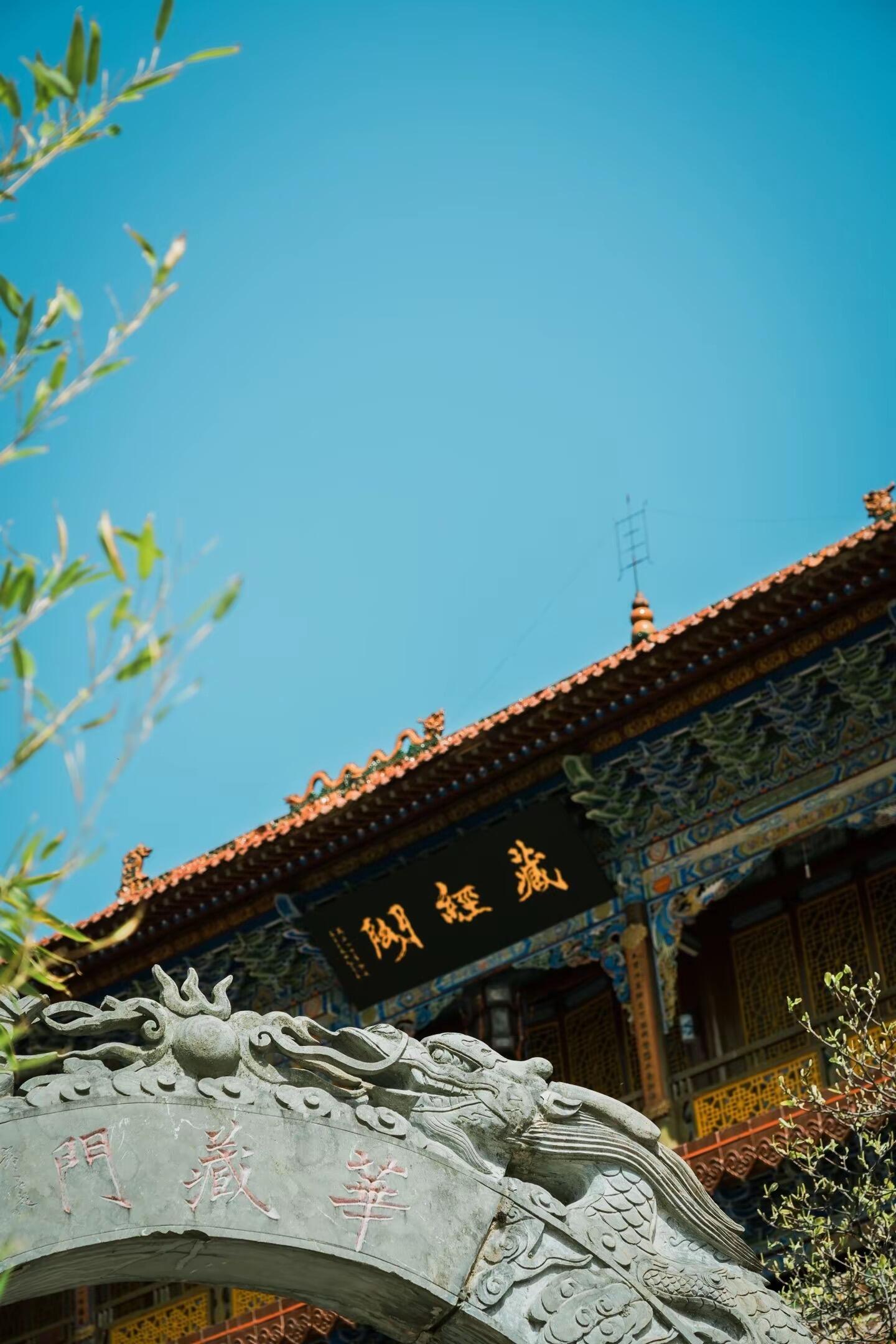 沿着石阶往上走,脚下的石板已被岁月磨得发亮,缝隙里长出的青苔在雨后泛着油绿。转过几重院落,便见主殿飞檐凌空。不同于中原寺庙的对称工整,这里的建筑带着西北特有的粗犷:梁柱用料极粗,暗红色的漆皮已经斑驳,露出底下木质的纹理;斗拱造型简洁,却以夸张的尺度撑起厚重的屋檐。更妙的是殿角的风铃,由青铜铸成,表面刻着六字真言,风过时发出的声响低沉悠远,与松涛声交织在一起,让人恍惚间不知身在何处。