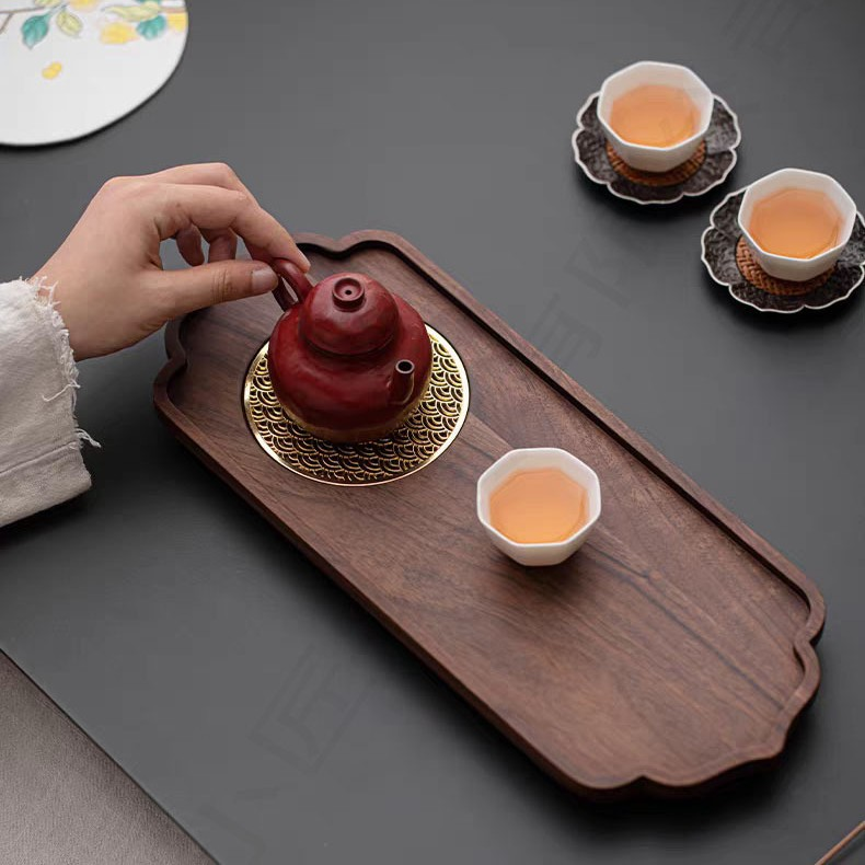 在快节奏的日子里,能让时间慢下来的,往往是一泡热茶、一方好盘。就像这张图里的黑胡桃木茶席——朱红茶壶卧在描金纹里,茶雾裹着暖香漫开,连木纹都像在轻声说:「坐下来,好好喝杯茶吧。」