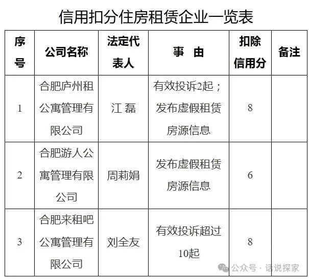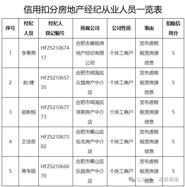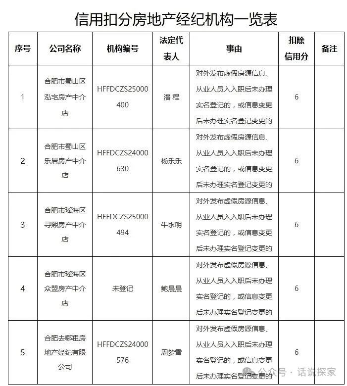 据合肥市房产局发布的最新消息,有多家房地产经纪机构、经纪从业人员和住房租赁企业被扣信用分。