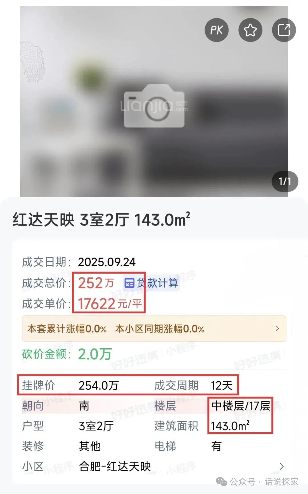 据某平台数据显示,包河区的红达天映在9月24日成交第一套房源,户型143平,挂牌价254万,成交总价252万,单价1.76万,还是小高层的中楼层。
