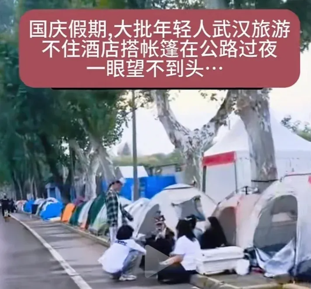 先是天公不作美,台风加连阴雨,一半游客退订,说 “雨天拖行李旅游?疯了才去”。更狠的是,即使出来旅游,年轻人也不按套路来了,宁愿扛帐篷也不当 “冤大头”:武汉长江边堆出 “帐篷一条街”,青海湖的帐篷跟小蘑菇似的冒出来,自驾带吃带用,见风景好就停下,“省好几千酒店钱,不香吗?”