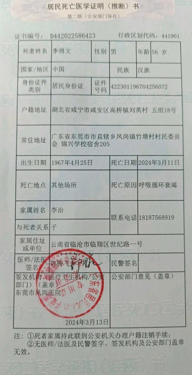 这条信息是从李德民的堂兄那里得来的,他是东莞凤岗镇锦兴小学的一位老师,已经有17年的时间了,年年都是三好学生,但是在三月十一日下午,他在一位单亲老师的寝室里被人发现死因未知,学校判定李先生是在自己的寝室里死的,因为他没有任何责任,所以要给他五万块钱作为补偿。