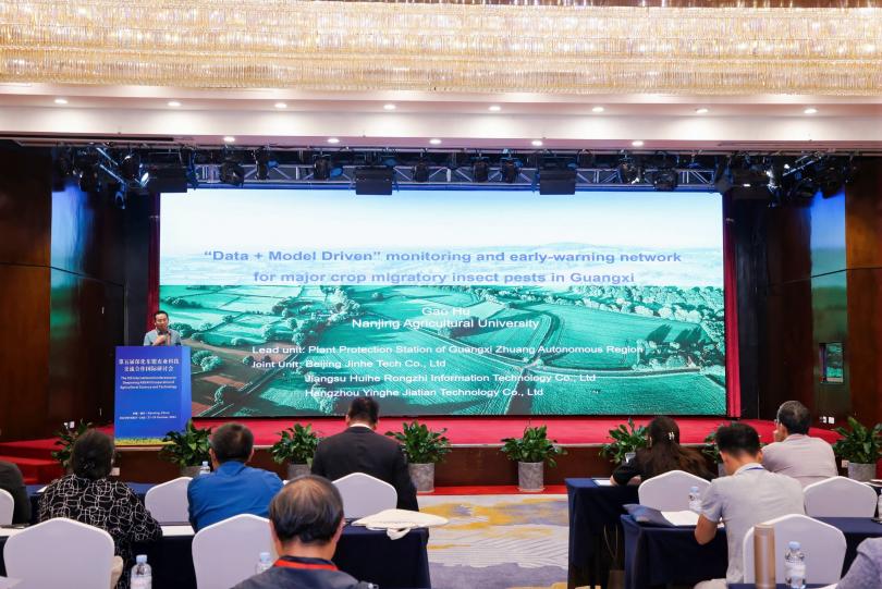 南京农业大学植物保护学院胡高教授在本次会议上代表合作方做了《基于“数据+模型”驱动的广西主要迁飞性害虫监测预警平台 》的学术报告。该预警平台由广西壮族自治区植保站作为用户方,联合南京农业大学胡教授模型团队、金禾天成总部及其算法中心(江苏慧禾融智信息技术有限公司)、生态中心(杭州盈禾嘉田科技有限公司)组成技术团队,共同建设完成,该平台已在实际工作中得到验证与应用。