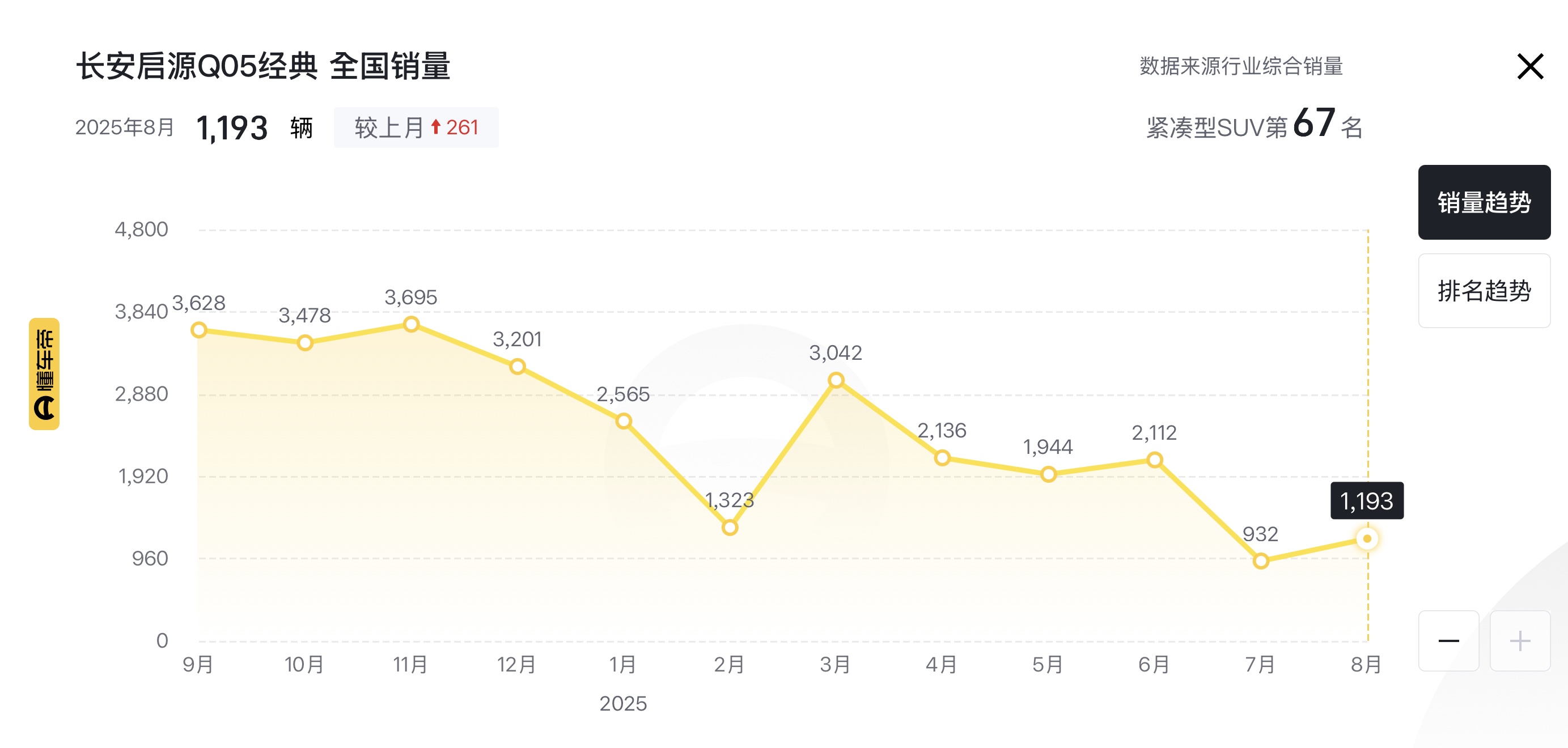 长安启源全新Q05同级车型包括比亚迪元UP(指导价7.48万元起)、宝骏悦也Plus(指导价7.68万元起)、五菱缤果PLUS(指导价7.58万元起)等。根据懂车帝销量数据显示,今年8月,长安启源Q05经典车型销量为1193辆。