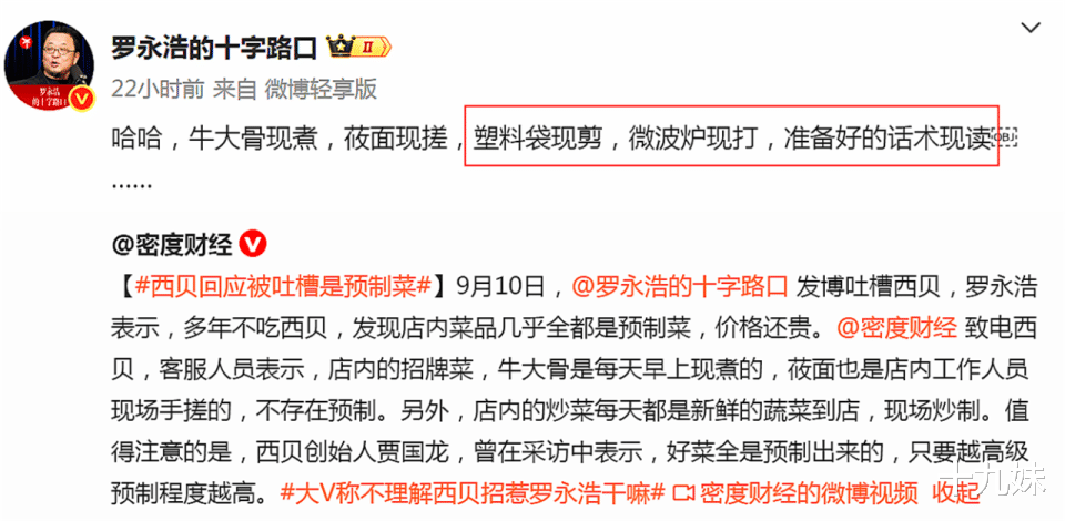 面对西贝的强硬态度,罗永浩也毫不示弱,先甩出一句话嘲讽:“哈哈,牛大骨现煮,莜面现搓,塑料袋现剪,微波炉现打,准备好的话术现读……”