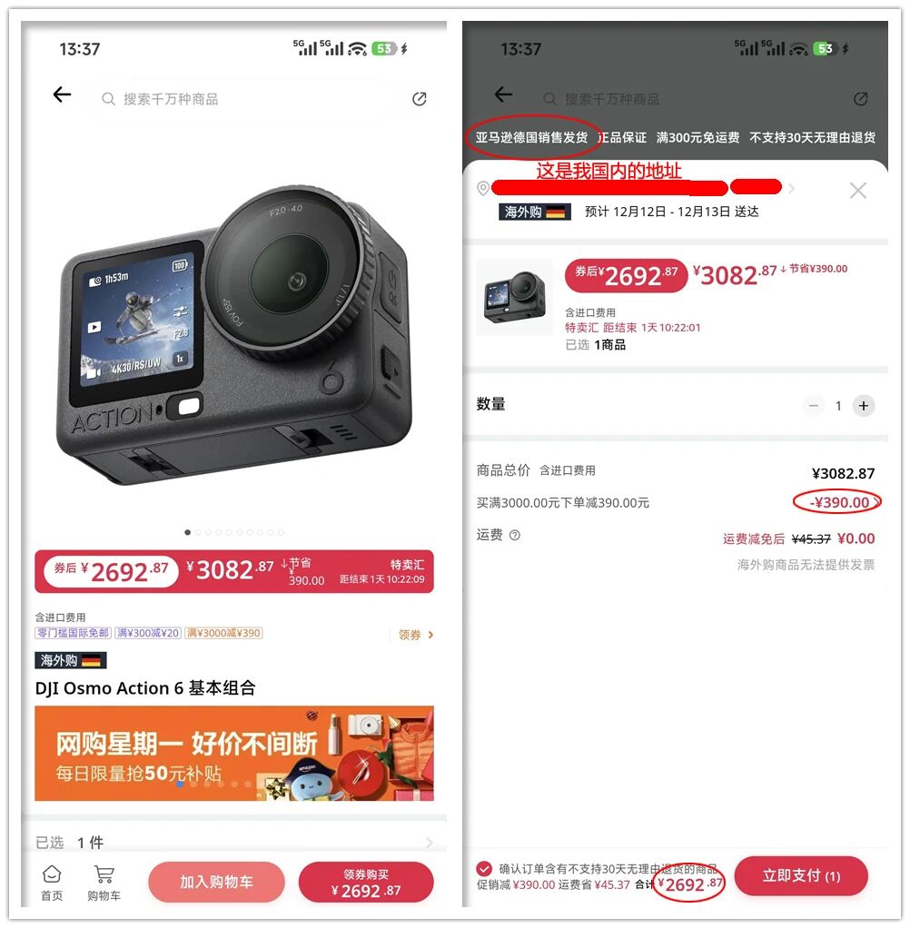 而亚马逊的大疆Action6卖3082.87元,但可以用390元优惠券和免运费券,最终实付2692.87元,这价格绝对是目前已知的全新最低价了。