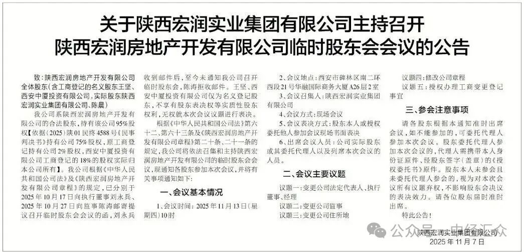 据西安官媒公告,遭受“套路贷”十余年的陕西宏润实业集团,将于11月13日主持召开陕西宏润房地产开发有限公司临时股东会议。