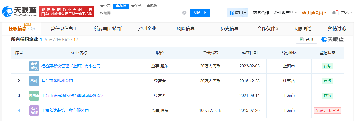 任职信息显示,倪某某名下关联4家企业,其中3家处于存续状态,分别为福客莱餐饮管理(上海)有限公司、靖江市徽味湘菜馆、上海市浦东新区祝桥镇闻闻香餐饮店,而上海羲达装饰工程有限公司已被吊销。