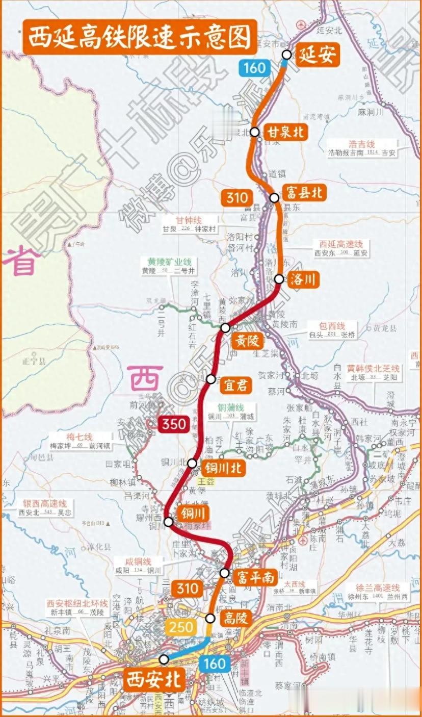 具体来看各段限速差异明显:西安北到耿镇段因衔接枢纽,时速限制在160公里;耿镇至高陵段提速至250公里;高陵到富平南段进一步提升至310公里;过了富平南进入开阔区域,直到洛川段可保持350公里的最高时速;洛川以北至既有包西线起点降至310公里;最后利用包西线接入延安的路段,时速为160公里。
