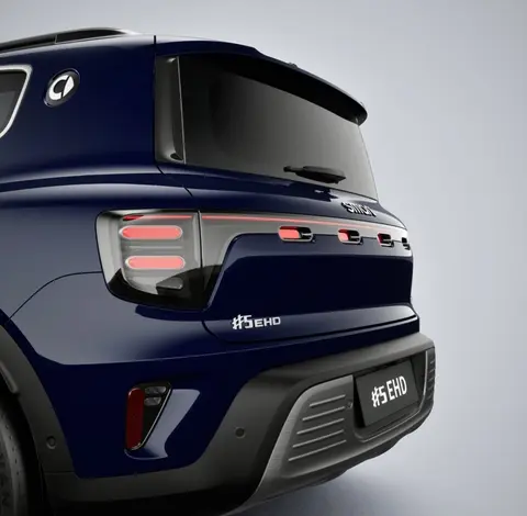 然后,看看这款车的外观,smart #5 EHD超级电混外观延续了纯电版的Boxy方盒子设计语言,在向方盒子造型靠拢的同时,保留了品牌标志性的圆形元素。前脸部分依旧采用封闭式格栅,但前包围护板造型与纯电版不同。整体视觉更立体,也更具SUV力量感。新车有5种全新外观颜色,分别是星漩蓝、粒子白、流沙金、苍岩灰以及赛博银。车身侧面兼具辨识度的细节是C柱上的smart字母LOGO,像一枚品牌印章,强化了辨识度。尺寸方面,新车的长宽高分别为4705/1920/1710毫米,轴距达到2900毫米,体量接近奥迪Q5。车尾部分,后包围也进行了重新设计,纯电版上的银色护板被替换为枪灰色饰板与全新牌照框架,让车尾层次更丰富,同时多了几分“探险气质”。