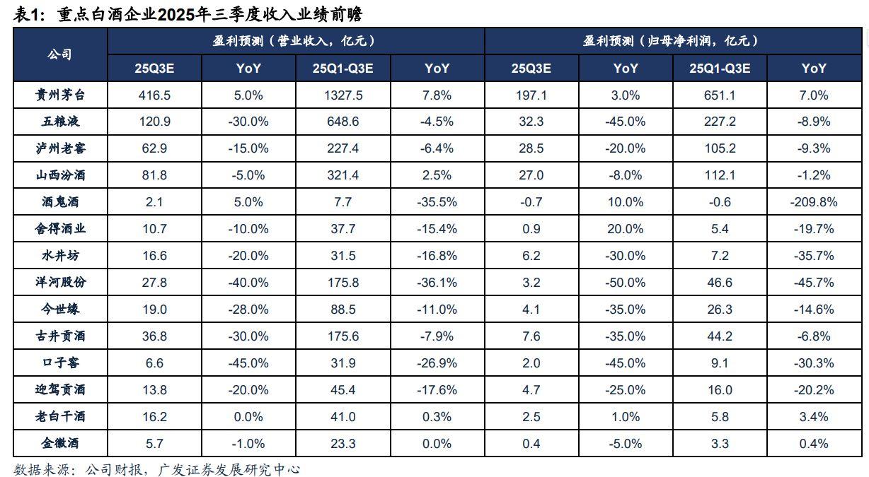 这份令市场为之侧目的报告出自于广发证券之手。在一篇名为《白酒持续调整,大众品表现分化——2025年三季报业绩前瞻》研报中,广发证券大幅下调白酒股三季度业绩预测,A股14家白酒上市公司,仅有贵州茅台、酒鬼酒、老白干酒能够实现微增,其他酒企业绩则出现了不同程度的下滑。