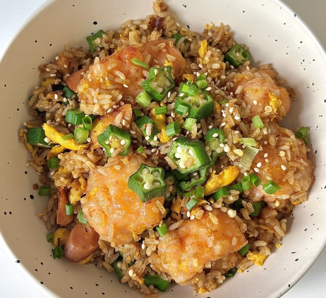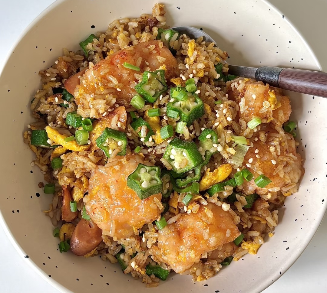 锅里补半勺油,爆香蒜末,倒入秋葵,大火快炒20秒,颜色更绿。加入米饭,用铲子压散,听“沙沙”声,那是米粒在喊“我要松绑”。米饭炒到跳舞,把虾滑碎一点点撒进去,让它表面遇热迅速定型,像给虾仁穿了层薄铠甲。把之前炒好的香肠鸡蛋回锅,淋生抽+蚝油+糖+白胡椒,手腕一抖,锅铲翻飞,30秒后所有食材均匀上色,关火,撒一把葱花,完工!