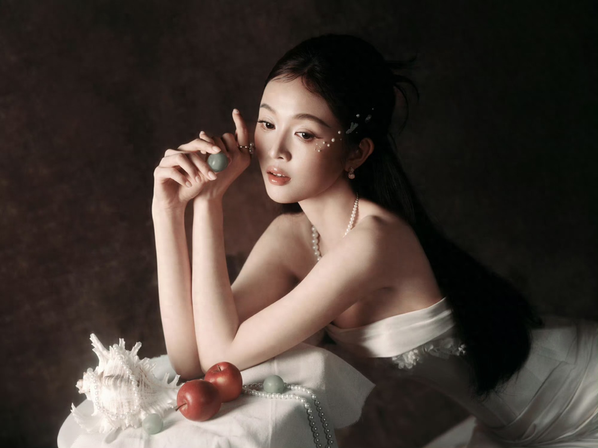 她的妆发同样考究,发型参考了唐代仕女的高耸云鬓,其间点缀的和田玉簪与淡水珍珠,每一颗的选择都旨在还原古典壁画中的仕女韵味。就连她手中的团扇,也是绘有工笔花鸟、边缘镶金的精致艺术品。