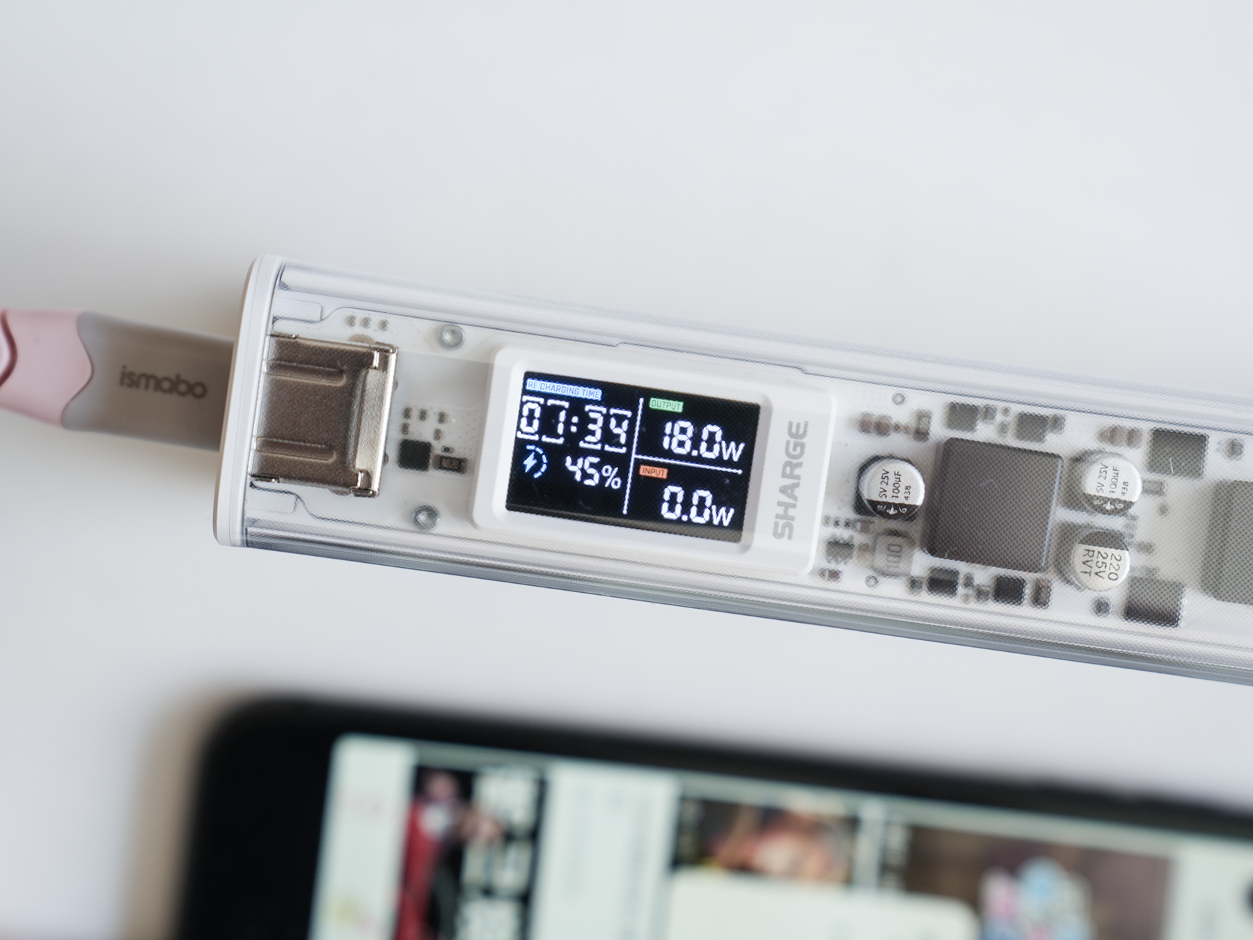 实测连接USB-C接口为iPhone 8P和iPhone 12充电,峰值功率可以维持在18w左右,为vivo X200s充电,可以激活快充,峰值功率可以维持在45w左右。