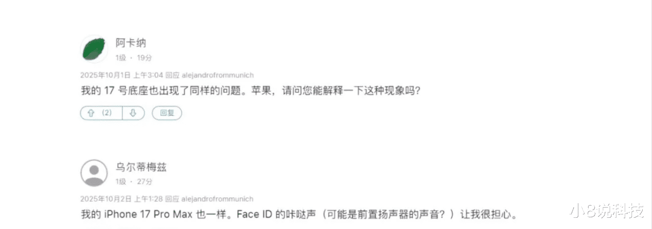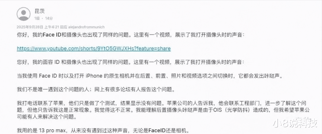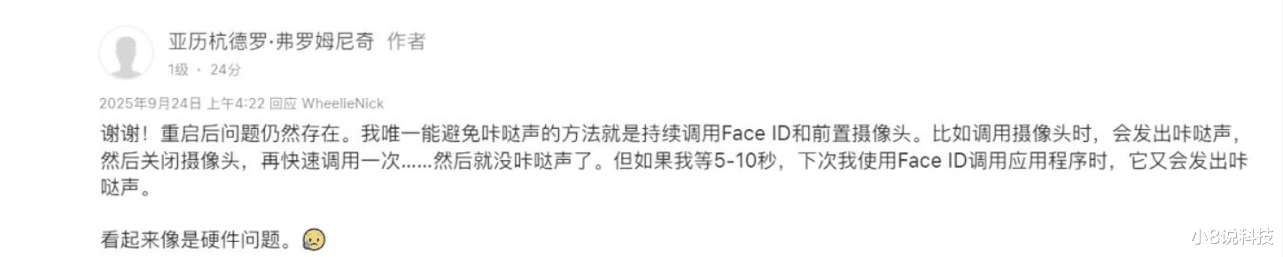 结果没想到,才过去没多久,又有用户在苹果官方社区里喊冤,说前置相机和 Face ID 的区域会发出清晰的“咔哒声”。