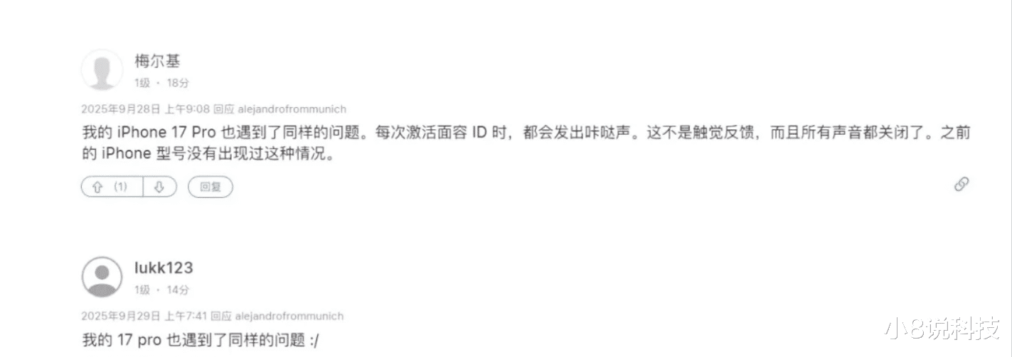 发帖的人一说,立刻就有不少用户跟帖回应,说自己在用 iPhone17 Pro 的时候,也发现解锁或者视频通话时会出现同样的声音。
