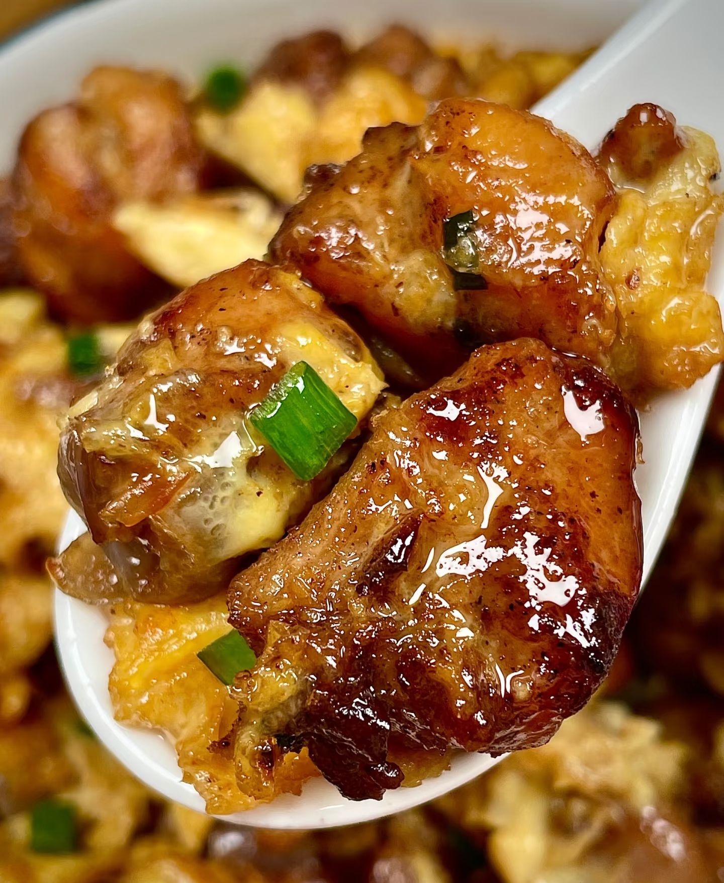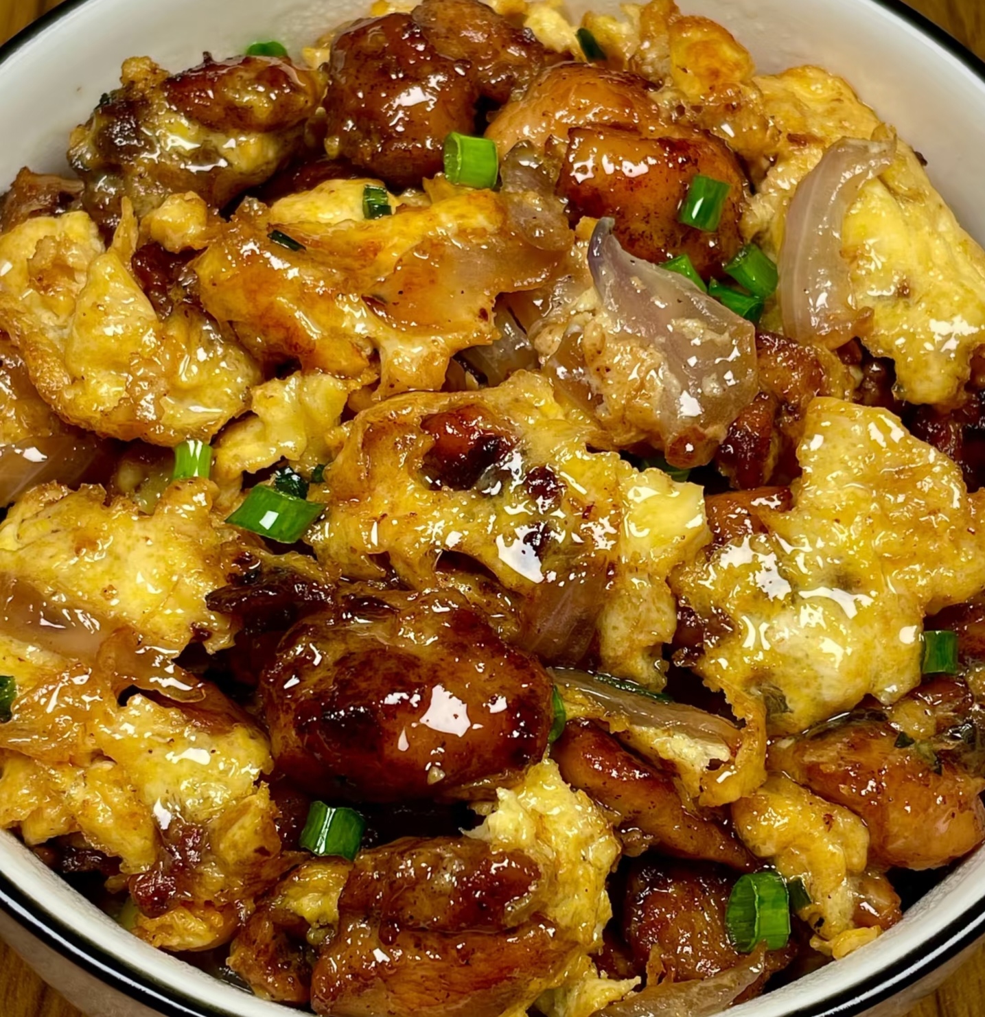 把鸡丁连油一起倒进蛋液里,撒葱绿,轻轻翻拌——让每一粒肉都穿上“蛋衣”。