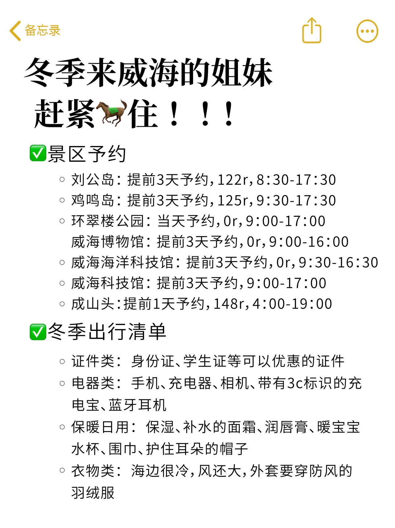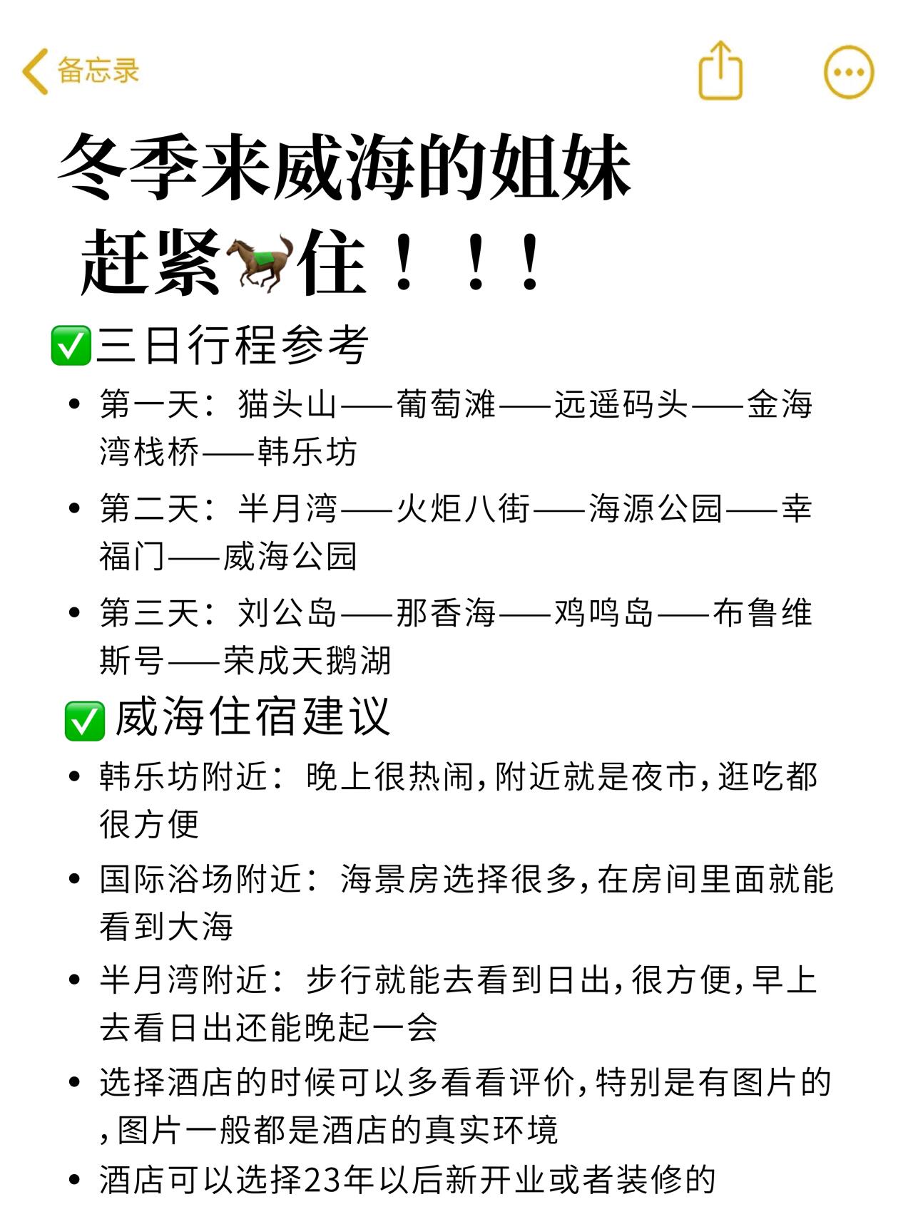 如果有3️⃣天时间的话,差不多能把威海景点玩个大概,⭕️一天去猫头山🐱这边玩一天,⭕️一天去打卡几个海边公园⛲️,⭕️还有一天去荣成区看限定的野生大天鹅🦢