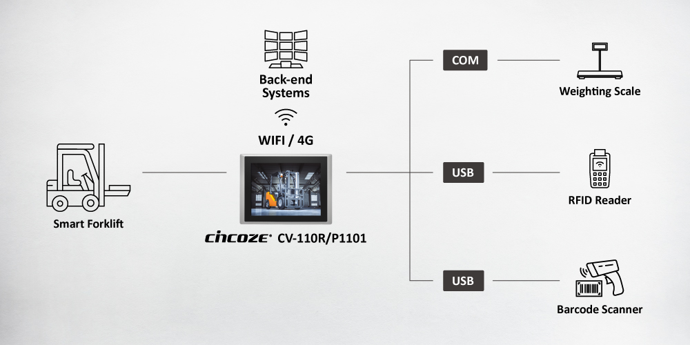 叉车屏幕上的实时信息显示仰赖无线传输。Cincoze工业平板电脑(CV-110R/P1101)内建mini PCIe与SIM卡插槽,可扩充无线通信模块,实现与后端系统的实时数据传输。此外,叉车在作业中需要连接条形码扫描仪等接口设备,能使用原生丰富的I/O(LAN, COM, USB, DIO)整合相关装置。为避免因熄火导致数据遗失,亦可增添IGN功能,设定延迟开关机,确保数据完整与系统稳定。