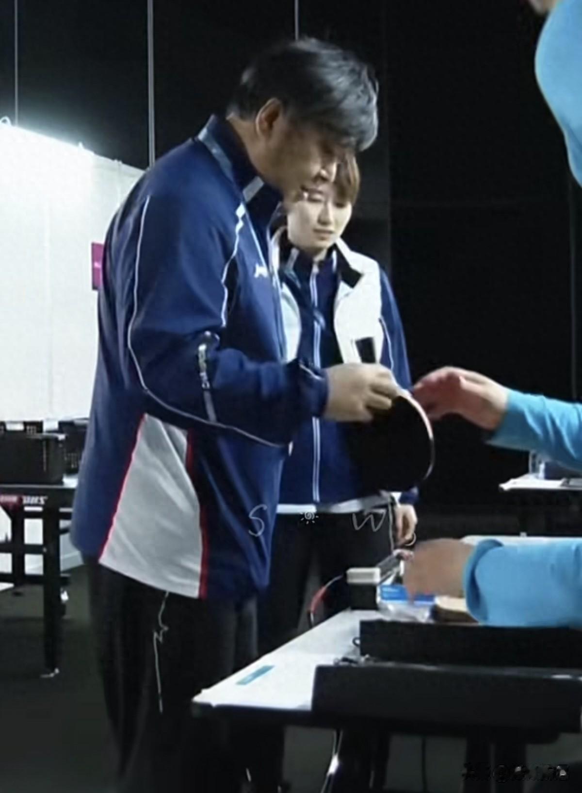 王楚钦比赛前,孙逊教练拿着王楚钦的球拍和衣服去检录了,有了主管教练真的很好,很多事情教练都会帮忙,还会帮忙挑球。