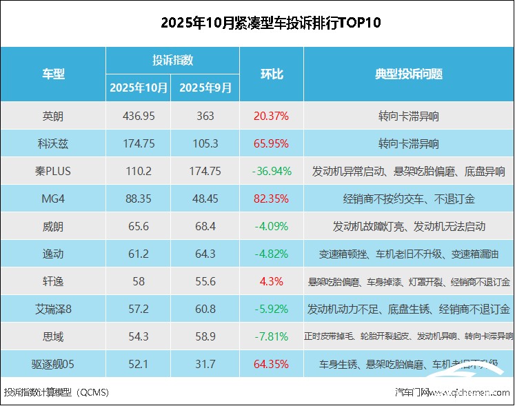具体来看,TOP10中,5款车型投诉指数出现不同幅度上涨,另有5款车型投诉指数呈下滑趋势。这其中,互为姊妹车型的英朗与科沃兹投诉指数延续上涨趋势,核心问题仍聚焦于转向卡滞异响。全新MG4成为榜单中的“空降兵”,上市不足3个月便跻身第四名。大量车主反映经销商存在不按约定交车、订金不予退还的情况。驱逐舰05继9月上榜后,10月投诉指数又环比上涨64.35%,车身生锈、悬架吃胎偏磨、车机老旧不升级似乎有抬头之势。轩逸的投诉指数虽环比基本持平,但投诉内容仍围绕长期存在的“痼疾”,未能出现实质性改善。与之相对的是,秦PLUS、威朗、逸动、艾瑞泽8、思域5款车型的投诉指数均出现下滑。其中秦PLUS表现最为突出,投诉指数环比下滑36.94%,成为榜单中降幅最大的车型。