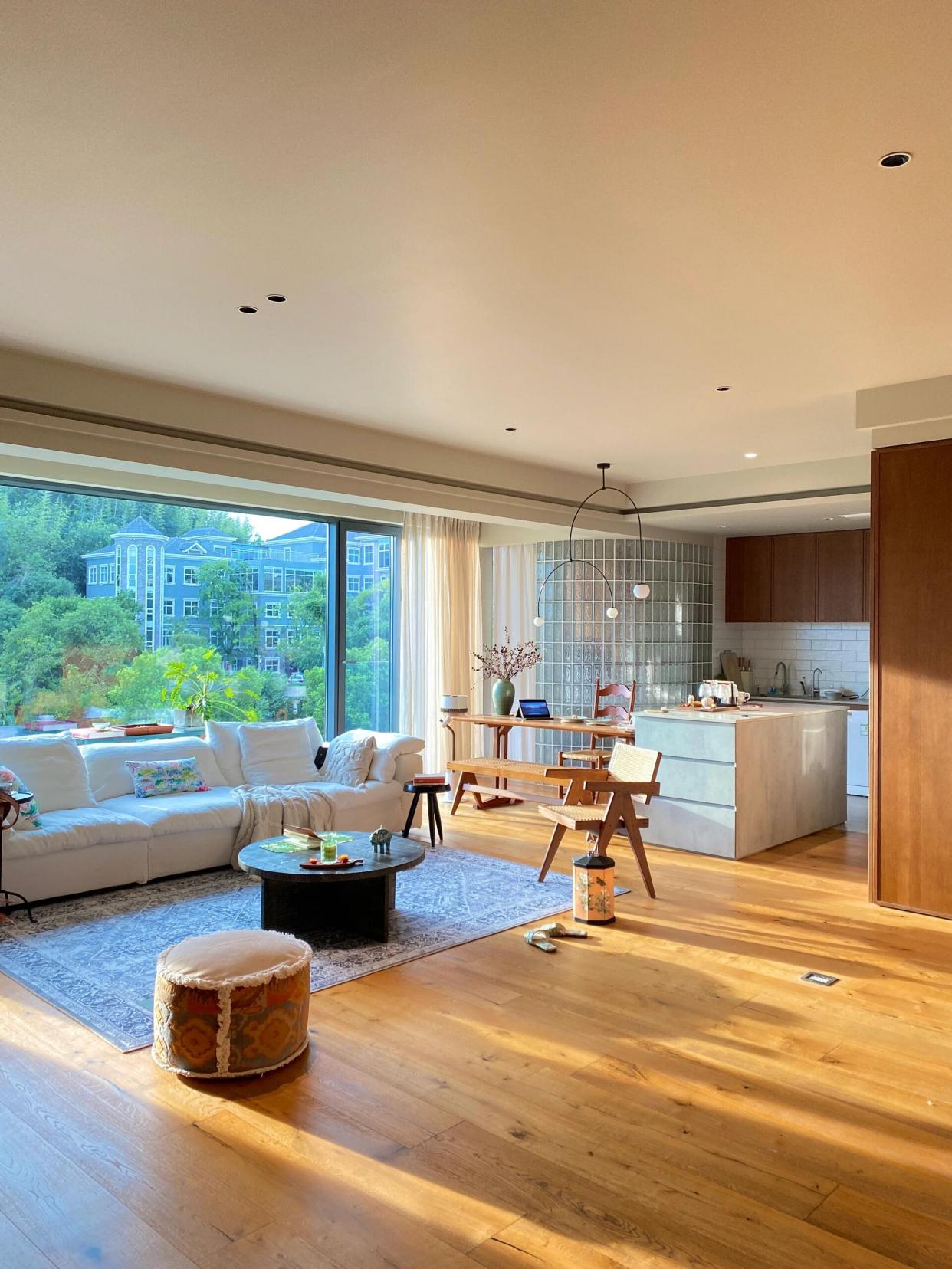 网友@不叫菜菜 分享了自家经验:原本还担心中间户暗沉沉的,把客厅和阳台之间的墙拆掉后,整个客餐厅敞亮开阔,再配上客厅的大落地窗,空间显大又通透。